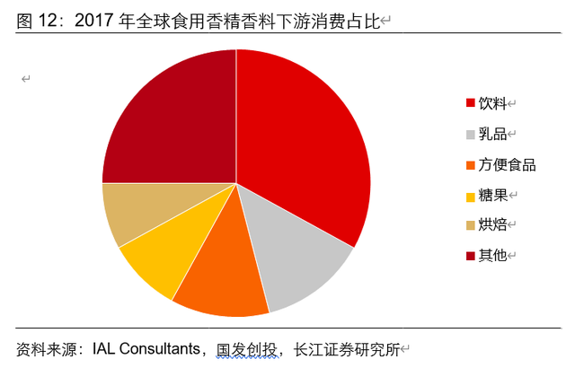 应用以食用和日化为主,作为嗅觉的“美化剂”。全球香精香料市场中,食用香精香料占比约为 56%,日用香精香料占比约为 44%(烟用香料市场规模相对较小,国外烟用香精香料划分在食用香精香料领域)。食用香精香料能够给食物原料赋予香味,矫正食品中的不良气味,同时可以补充食品的香气不足,稳定和辅助食品中的固有香气。食用香料主要应用于饮料、乳制品、方便食品、糖果和烘焙食品中,终端需求市场较为分散。日化香精香料主要用于矫正日化产品中不适的气味,产生令人愉快的气味,提升产品档次,主要应用于香水、化妆品浴室用品清洁剂及洗涤剂等产品中。食品用香精又可以分为多个种类,其中规模占比最大的为饮料。整体看,全球香精香料下游消费较为分散, 单一市场需求变动对整体需求影响较为有限。下文将继续从细分市场分析香精香料产品需求及增速。