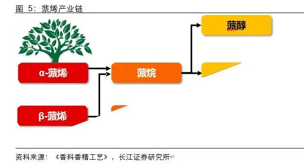 蒎烯:产业链下游需求集中于香叶醇和柠檬醛。蒎烯存在于天然松节油中,世界松节油年产量在 30 万吨左右,蒎烯主要有 α 型和 β 型两种异构体。全球蒎烯年生产量超过 9 万吨,主要用于合成芳樟醇、香叶醇、柠檬醛等多种大宗香精香料。由于天然松节油主要从松树松脂提取,自然产量受限,天然半合成市场供给仍趋紧。