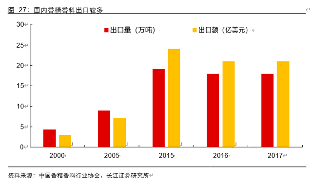 薄荷醇进口量较大,国内市场空间广阔。从进口产品看,我国进口量最大香料产品为薄荷醇,2017 年进口量在 1.2 万吨,进口平均单价为 16.4 美元/千克,主要由于印度等地薄荷醇生产成本较低,具备一定成本优势。其次,橙油、苯甲醛和苄醇进口量在 1000 吨以上;还有部分小批量的高端香料产品(突厥酮、玫瑰醚、大马士酮、高品质二氢茉莉酮酸甲酯),产品批量较小,附加价值较高,国内企业无法进行生产,需要从国外进口。