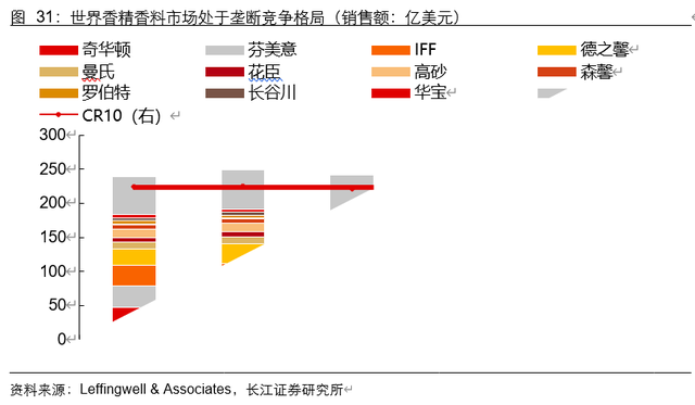 产品竞争差异化,注重消费属性延伸。由于香料产品需要经过调香生产香精,不同的香料产品具备差异化的特征,且能够形成一定互补。市场仍会追逐生产不同种类的香精香料产品,以追求产品更新,满足对新型香味的需求。奇华顿等国际香精香料巨头每年需要合成成百上千种新化合物,经调香人员的评价和合成工艺评价后, 其中只有极少数化合物能够作为新型合成香料进行生产。这些新型产品的应用对香精的质量和新型香精的创造有着重要的作用。虽然在单个品种的研发需要大量投入,但是一种新型香精得到应用便会获得更大的市场空间,如十九世纪六十年代玫瑰醚、七十年代突厥酮和突厥烯酮以及八十年代的二氢茉莉酮酸甲酯。国际香精香料市场整体处于差异化竞争阶段,即使是国际香精香料巨头也需要从竞争对手采购相关产品进行复配。