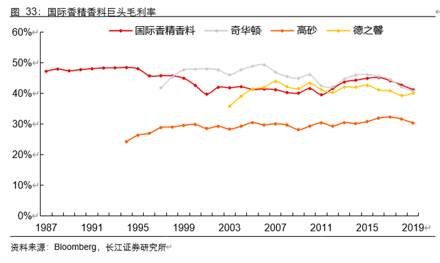 市场高度垄断,逐渐形成“四大金刚”格局。全球香精香料市场垄断在前 10 家巨头企业手中,2017 年行业 CR10 为 77.0%,且随着龙头专利布局加强,产品布局拓宽,行业护城河加深,市场集中度有进一步提升的趋势。全球香精香料市场,已经形成“四超多强”的供给格局,奇华顿、芬美意、国际香精香料和德之馨四家企业位于行业第一梯队,第二梯队主要为日本、美国和中国的企业如曼氏、Frutarom(2018 年被IFF 收购)、高砂、森馨、罗伯特(芬美意持股)、长谷川和华宝国际。