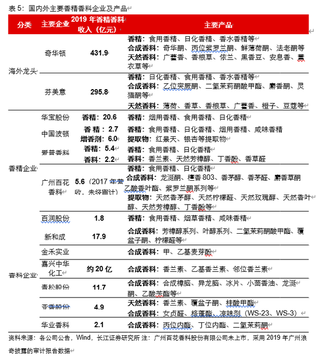国内营收规模较小,综合性香精香料企业较少。海外龙头企业如奇华顿和芬美意,营收规模庞大,产品结构丰富,产业链布局完善,在天然香料、合成香料和香精配方均有布局,形成完整的产业链布局。香精企业中,华宝国际、中国波顿、爱普香料等在食用香精、日化香精和烟用香精领域各有所长。香料企业中,新和成、金禾实业和嘉兴中华化工以合成香料为主,青松股份以天然香料为主,亚香股份在天然香料和合成香料均有所布局。与国外企业相比,我国香精香料企业规模较小,产业链一体化程度仍有较大提升空间。