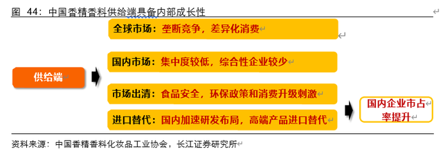 展望未来,国内食品安全、环保标准和消费升级将显著提升行业供给的竞争壁垒,小型企业将更难通过客户质量验证、国家的环保审批和客户的品牌选择,面临退出市场的风险,供给端有望出清。国内香精香料龙头企业具备资金和技术优势,市场占有率有望逐步提升。