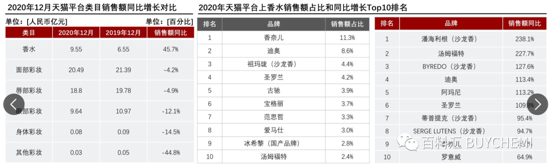 与2019年12月相比,2020年由于疫情需要佩戴口罩,脸部被遮挡导致消费者化妆需求减少。作为个人风格和精致度的体现,香水在疫情期间成为彩妆的替代品,2020年12月香水的销售额同比增长45.7%。