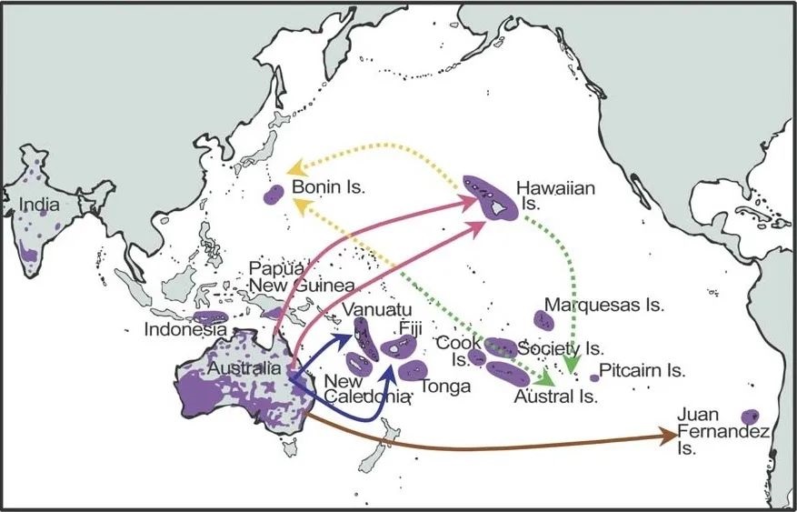 檀香种类的分布与传播(引自美国植物学报)