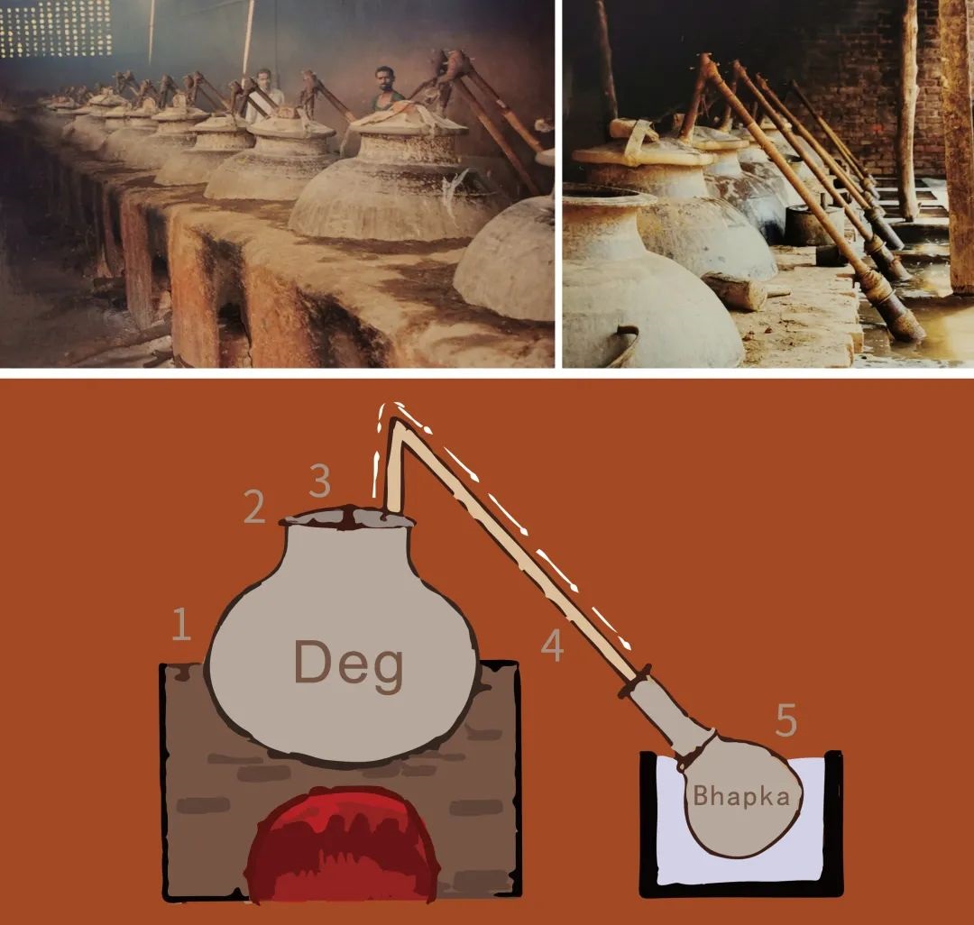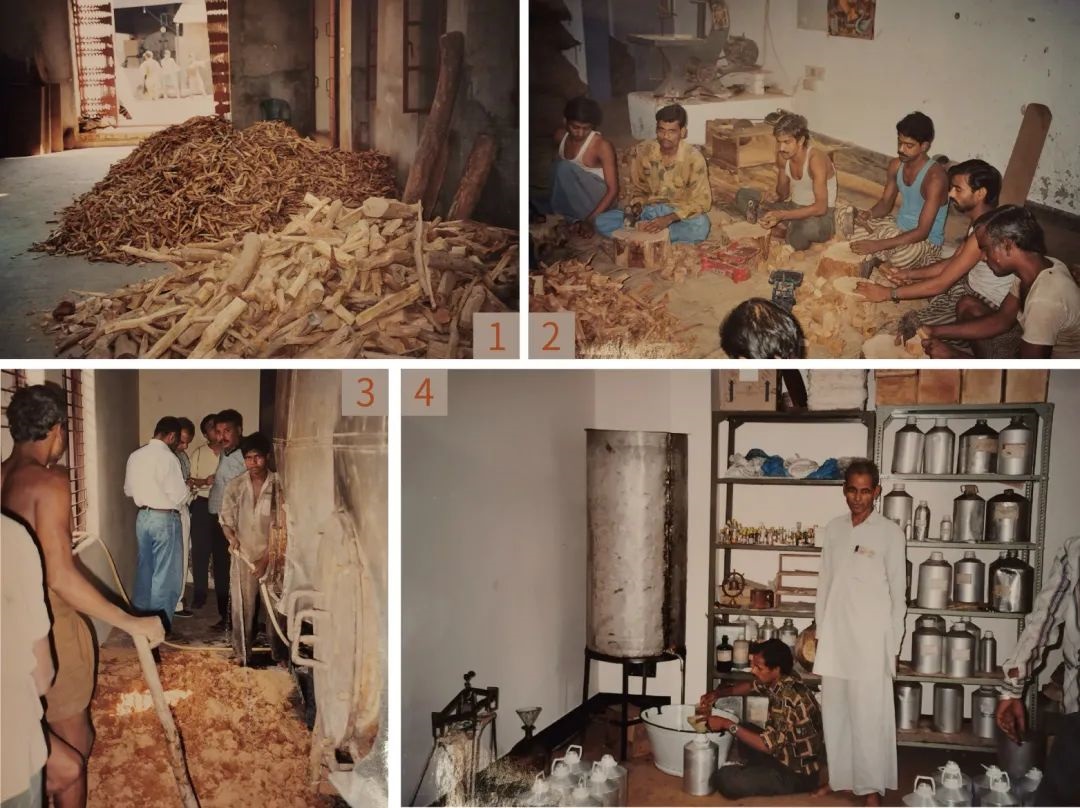 印度极富盛名的传统檀香精油产品是Attar(Ittar)。Attar的生产工艺,即Deg 和Bhapka流程,非常独特。一个装置通常包括一个较大的可以直接加热的铜罐(即Deg),用1-2个通常是竹子做的弯管连接到另一个较小的,里面盛着檀香精油铜罐(即Bhapka),这个小铜罐(Bhapka)放置于冷水池中进行冷却。生产时,在Deg中按照配方放入水和不同的原料,如鲜花、香草料、香辛料、焙过的泥土等原料,连接并密封Deg和Bhapka及弯管后,直接用明火加热Deg进行蒸馏,馏出的香气成分经过竹管后进入Bhapka,经过冷水冷却后,直接被Bhapka中的檀香精油吸收。蒸馏结束后,吸收了馏出香气的檀香精油再经过多年的陈化就完成了成品Attar。与调香师调香一样,Deg中原料的配方和比例就是调香的秘密,决定了最终Attar的香气特征。用玫瑰花瓣这样生产出来的Attar就叫玫瑰Attar。