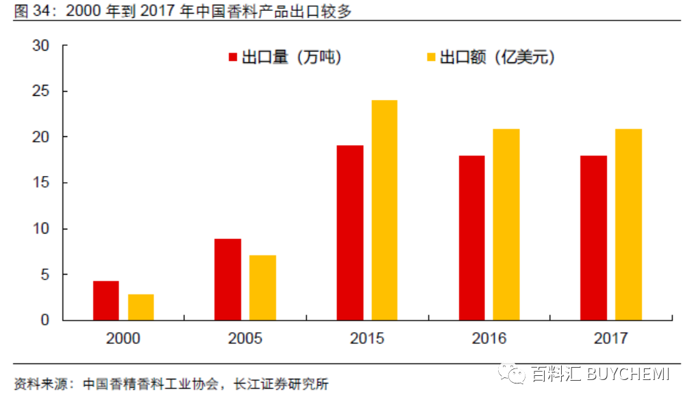 国际竞争阶段(2000-至今):新世纪以来,我国化学合成工艺和分析仪器取得了较大突破,香精香料产品质量进一步提升,产品种类得到进一步丰富,产量进一步扩大,市场空间进一步释放,加入WTO 后,我国合成香料产业开始逐步参与国际市场竞争,我国在合成β-苯乙醇,苯甲醛 fun88乐天堂,香草醛等香精香料产品建立起自身的竞争优势,逐步由进口依赖转向为出口发展模式,此阶段,中国在大宗香精香料产品形成一定成本优势,在世界香精香料行业崭露头角。