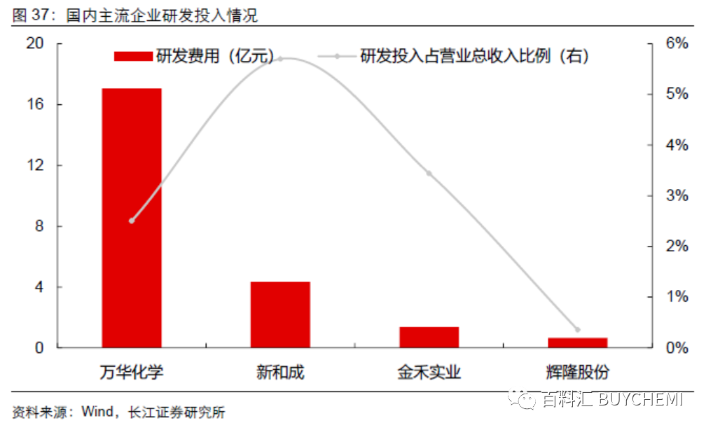 注重研发投入,布局内生增长动力。目前,万华化学、新和成和金禾实业在研发端布局较高,2019 年新和成、万华化学和金禾实业研发投入占营业总收入比例达到5.7%、2.5%和3.4%。中国合成香料龙头企业在研发端投入增加,逐步拓展新的产品和合成工艺,打造多元一体化供应能力,形成企业核心竞争力。