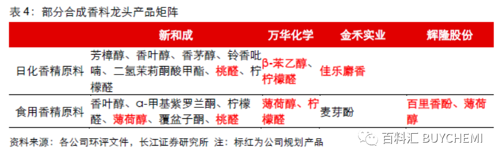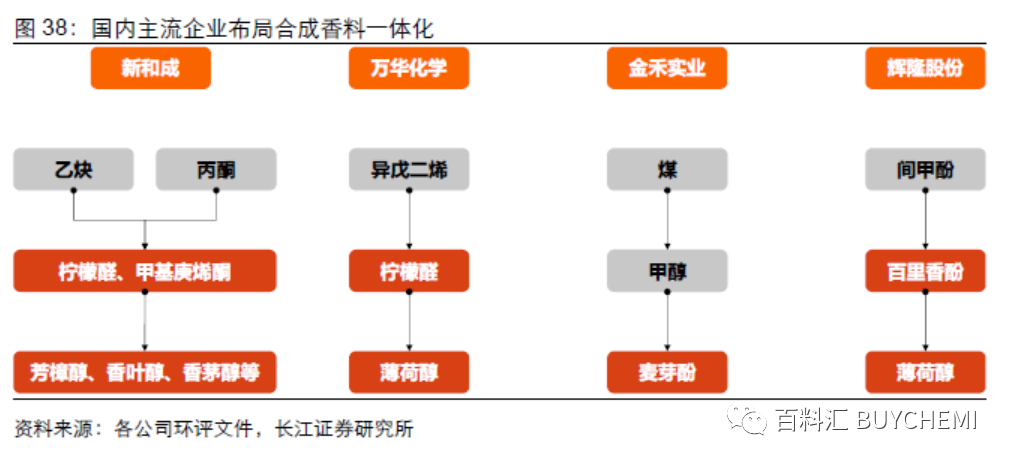 多元产品矩阵,提升消费粘性。目前国内合成香料企业中,新和成产品布局最完善,涵盖日化香精和食用香精原料中多个产品,差异化产品涵盖青草香、铃兰香、覆盆子香等多种香型,多元化产品结构能满足下游客户复配需求。万华化学布局日化香精原料β-苯乙醇和食用香精原料薄荷醇和柠檬醛,一定程度满足差异化布局。未来万华化学有望以柠檬醛为核心,拓展下游多个产品,进一步丰富产品结构。
