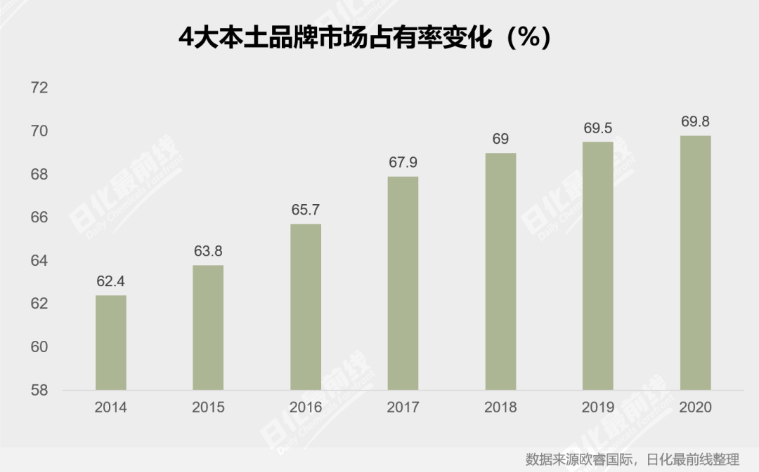 头部的4个大本土品牌立白,雕牌,白猫以及榄菊的市场份额还有逐年上升的趋势,在2020年4大本土品牌的市场份额将近70% fun88乐天堂.