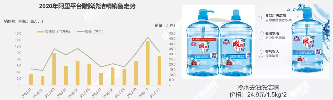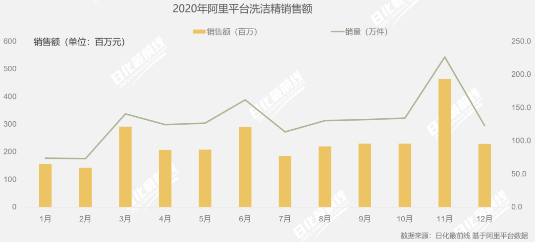 2020年阿里平台洗洁精产品线上销售额为11,9亿元,同比增加24,6%。销量约3700万+件,同比增加32,9%。 fun88乐天堂官网是什么。