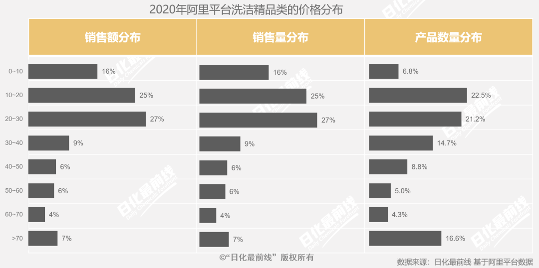 从销售额来看,洗洁精的价格以10-20和20-30元为主,占比超5成,而0-10元价格区间紧随其后,占比19% 乐天堂fun88靠谱吗,从销售量和产品数量分布上来看,10-30元区间的洗洁精占比最大。