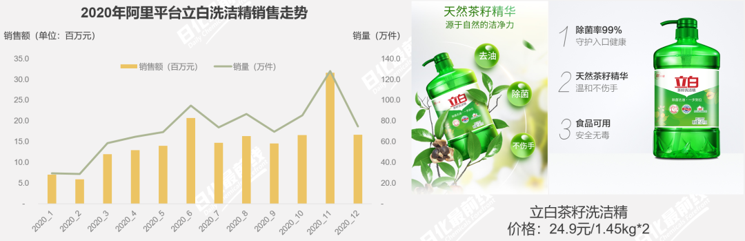 立白洗洁精在阿里平台上的销售额1.83亿元,销量864万件,销售额同比增速39%;