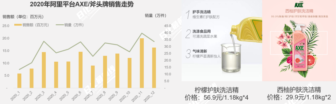 AXE/斧头牌洗洁精在阿里平台上的销售额1.48亿元,销量将近340万件,销售额同比增速38%;