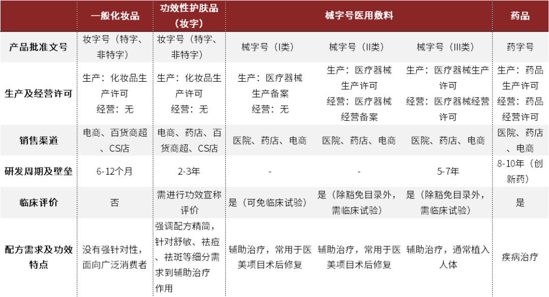 图表: 功效性护肤品、械字号医用敷料、药品对比