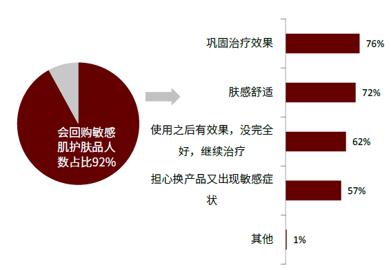 敏感肌人群品牌忠诚度高,回购意愿强。敏感肌肤频繁更换护肤产品易引发过敏反应或加重敏感程度,因而转换成本及风险较高。品域美创调研(2019年5月发布)显示,消费者回购敏感肌相关护肤品的比例高达92%。
