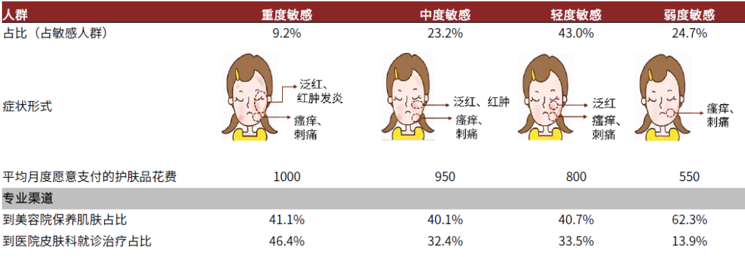 皮肤敏感程度不同,对皮肤学级护肤品的消费习惯亦有所差异,重度敏感肌人群是核心用户。整体上,皮肤敏感程度越高的客群,其对于日常护肤越为重视,年度护肤品消费金额越高,对品牌回购意愿和依赖度更强,且更易由医院/美容院等专业渠道转化。