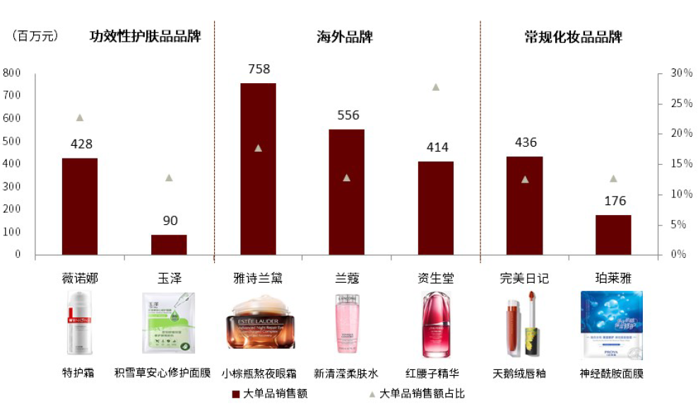 产品功效可见性强且差异化高,能够打造市场认可的大单品。领先的化妆品品牌通常拥有几款汇聚核心研究成果的大单品,代表性体现品牌产品力,形成持续复购和引流。