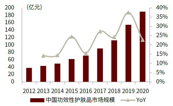 图表: 中国功效性护肤品市场规模及增速