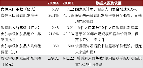 狭义市场:我们首先基于敏感肌人群,测算狭义的皮肤学级护肤品市场潜在规模,我们采用自下而上和自上而下两种方法测算。