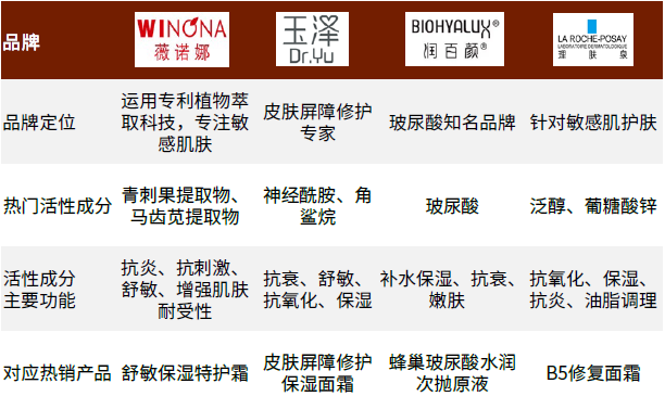 ► ①差异化定位:对本国消费者肤质的深入了解带来更突出的产品力。薇诺娜、玉泽及转型成功的理肤泉主打修复皮肤屏障、提升耐受性等,在舒缓基础上增加治疗属性,功能性较强,且消费者使用后效果很快可以体现;