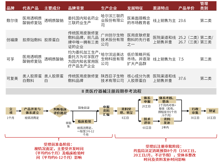 普通面膜通常报批特妆、妆字号,而医用的敷料则需要申报械字号批文,研发、生产及报批流程均有一定的准入门槛。医用皮肤修复敷料多为I类或II类医疗器械。II类医疗器械的注册流程通常需要约2年时间。