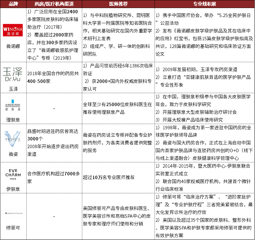 布局医院、医美等专业渠道,护城河深厚。部分功效性护肤品龙头,凭借创始团队的医学资源、优秀的产品力与强大的销售团队,率先切入皮肤科医院、医美诊所等,与专业渠道建立了稳定的合作关系。此外,部分功效性护肤品牌积极布局药房渠道,充分发挥医药流通公司强大的物流网络及广阔的终端网点布局优势,迅速开拓市场。