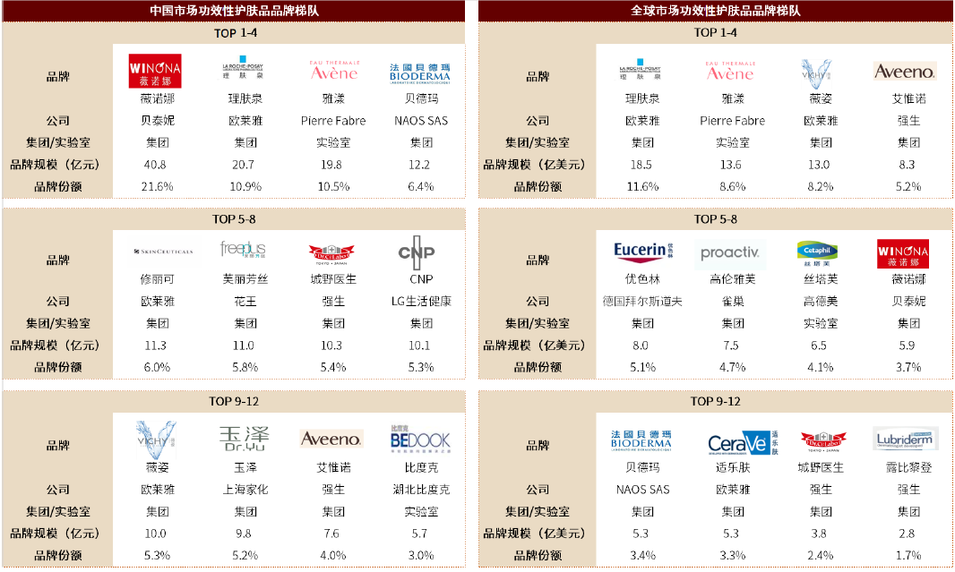 图表: 中国及全球功效护肤品牌规模梯队