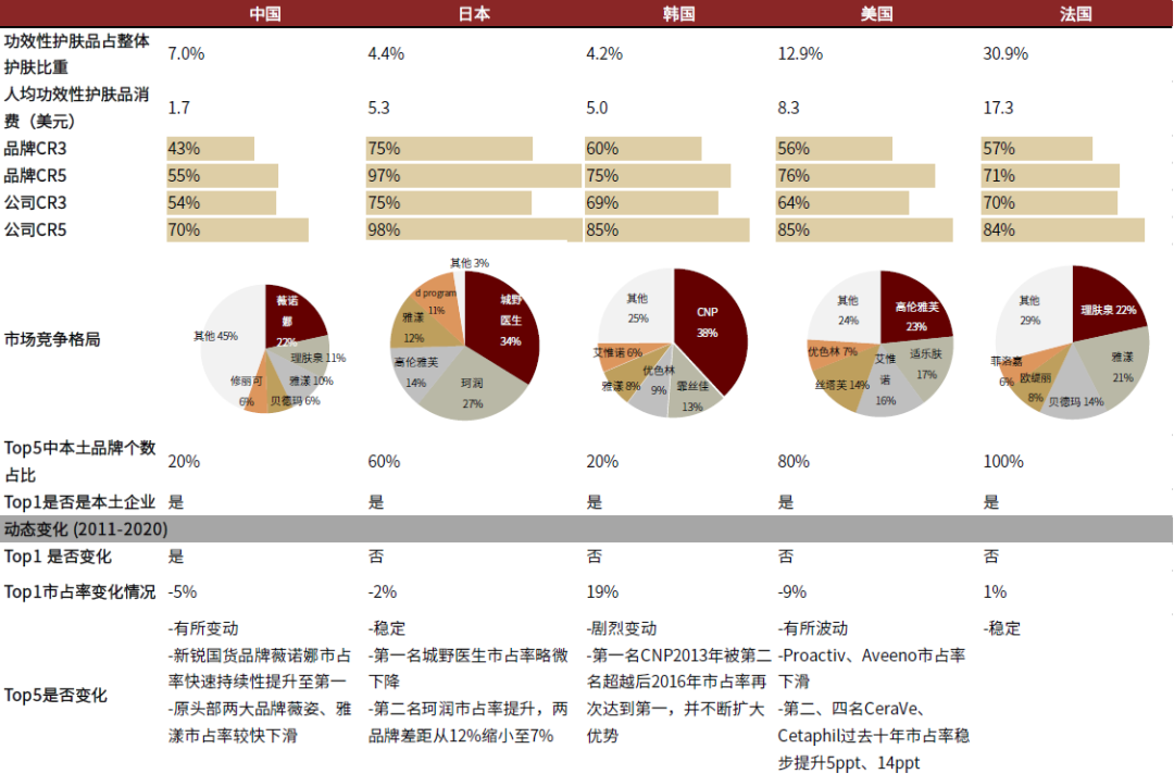 各国功效护肤市场集中度均较高,格局相对稳定