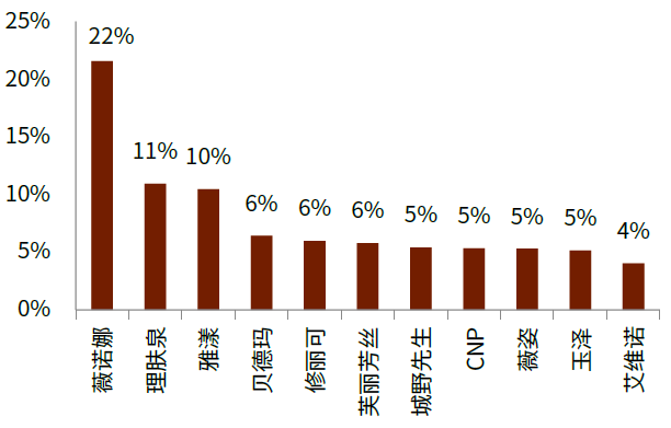 资料来源:解数咨询,中金公司研究部 注:统计区间为2020年天猫美妆双十一TOP20品牌数据