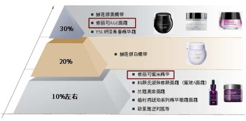 功效性护肤品强产品属性的结果是更易形成明星大单品,从商业逻辑上,我们认为功效性护肤品的发展路径更接近海外高端品牌,即以明星单品为引流核心,并依靠持续复购和产品线拓展形成的连带购买赢得可持续成长。