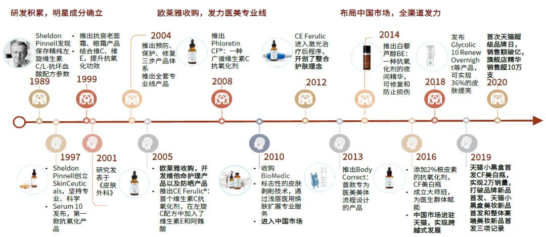 ► 欧莱雅收购,发力医美线:自2005年欧莱雅收购以来,品牌优化产品体验,丰富产品组合,并创立包含术前、术后方案,整合临床治疗、居家护理与专业疗程的“整全护肤”的概念,发力医美;