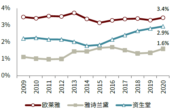 国内市场格局概览:集中度仍有提升空间。国内功效性护肤品市场品牌集中度较高,2020年CR3/CR5分别为43.0%/55.4%。对标海外,中国功效性护肤品市场2020年龙头份额约为22%,比照日韩的34% - 38%仍有一定空间。