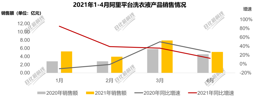 2021年1-4月阿里平台洗衣液总体销售额超过22亿元,销量超过4695万件+,销售额同比达38%;3月销售额最高,超过7 fun88乐天堂,9亿元,同比增长超过35%;.