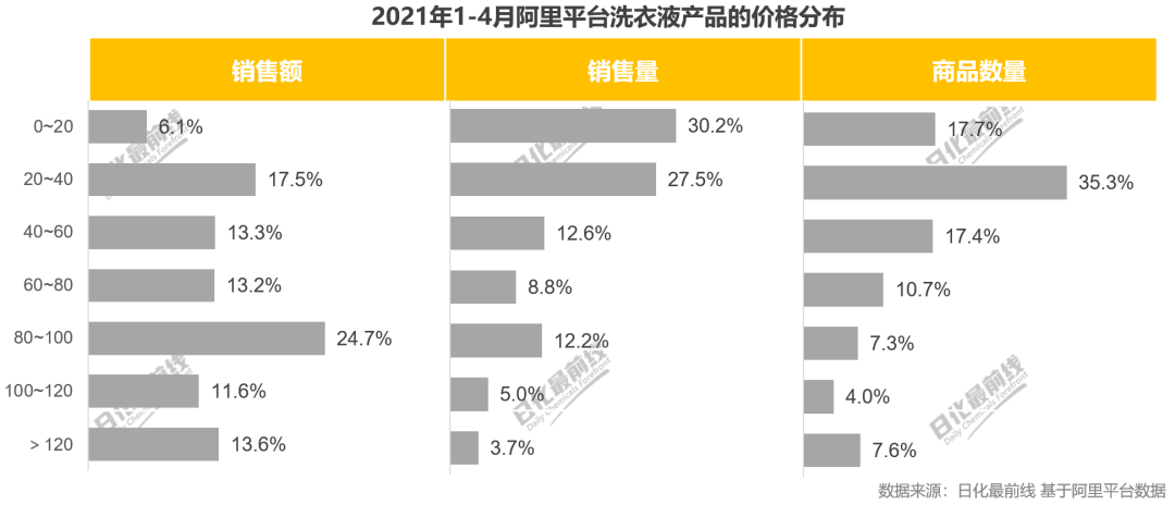 从销售额来看,2021年1-4月阿里平台上80-100元的洗衣液产品最受欢迎 fun88乐天堂官网是什么,其次是20-40元的低端价位和大于120元的高端价位产品,从销售量上看,0-20元和20-40元区间的低端价位产品销售量最好。