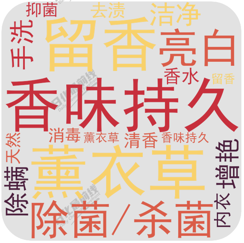 热销洗衣液产品大多强调其香味持久,抑菌杀菌的功效,另外薰衣草香味,亮白洁净,除螨,增艳等效果也受欢迎 fun88乐天堂。