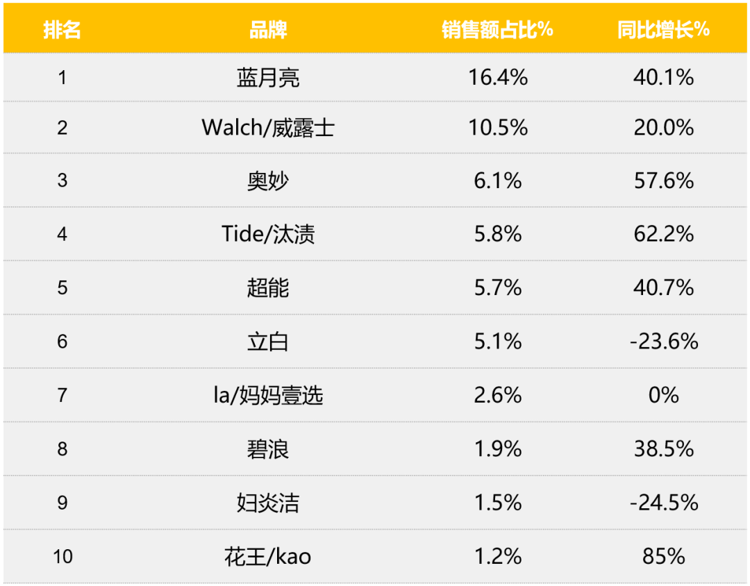 TOP10洗衣液品牌同比均有不同程度的增速 乐天堂fun88靠谱吗,其中花王/kao同比增速较快,达到85%。