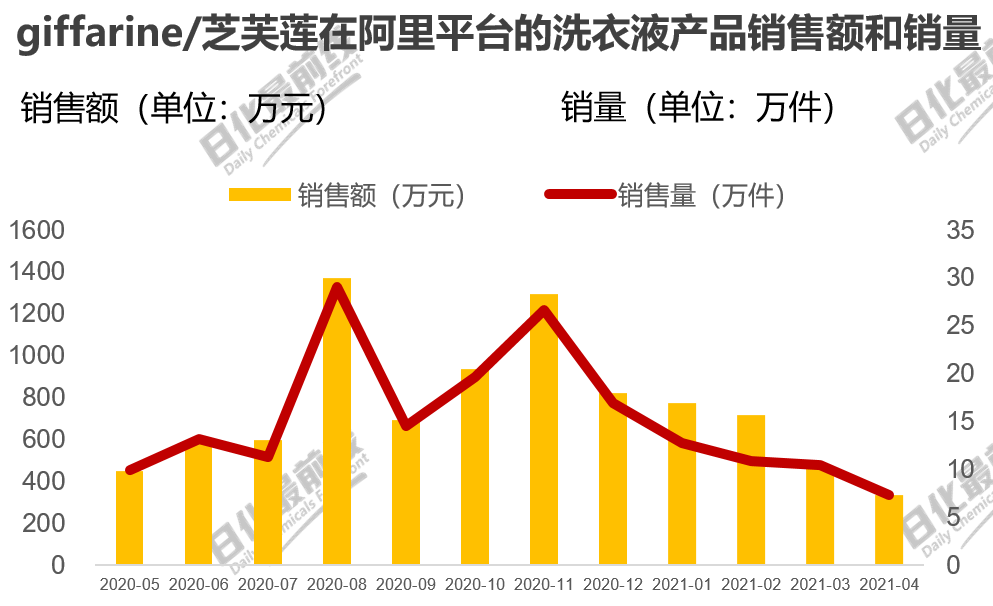 2021年1-4月阿里平台giffarine/芝芙莲洗衣液销售额超过2192万元,市场份额约为1%,销量超41万+件;主要热销产品为主打的内衣裤专用洗衣液。