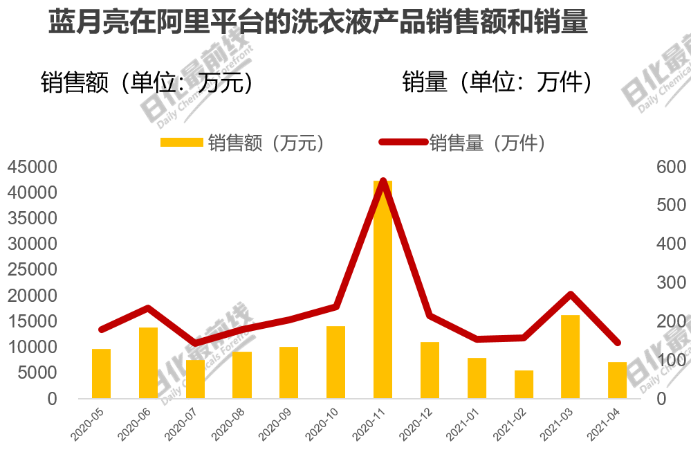 2021年1-4月阿里平台蓝月亮洗衣液液销售额超过3亿元,市场份额约为16,4%,销量超727万+件;主要热销产品为亮白洗衣液以及带有机洗专用的洗衣液。 fun88乐天堂。
