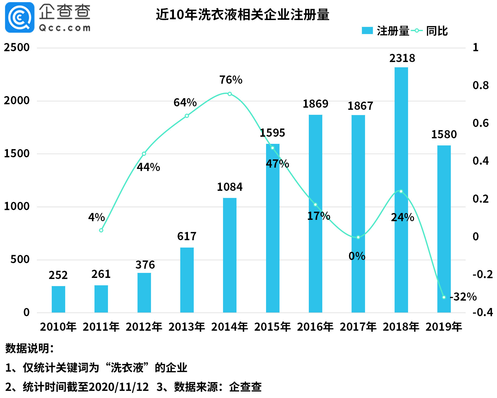 企查查数据显示 fun88乐天堂官网,2010-2018年我国洗衣液相关企业注册量总体呈现增长趋势,2010-2013年均注册量为377家,2014年增长率是近10年来最高的,同比增长76%,注册量达1084家,2018年注册量是近10年来最高的,共新增2318家,同比增长24%,2019年稍有下降,新增1580家,同比下降32%。