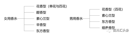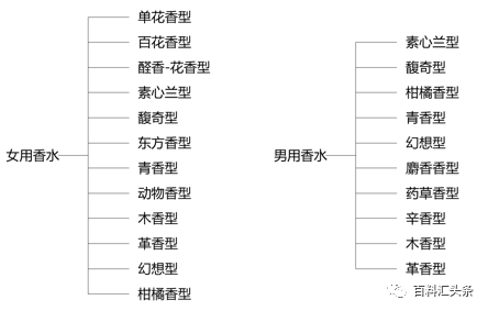 把香水香型分为女用和男用两大类,每大类又分为若干小类,如下所示。