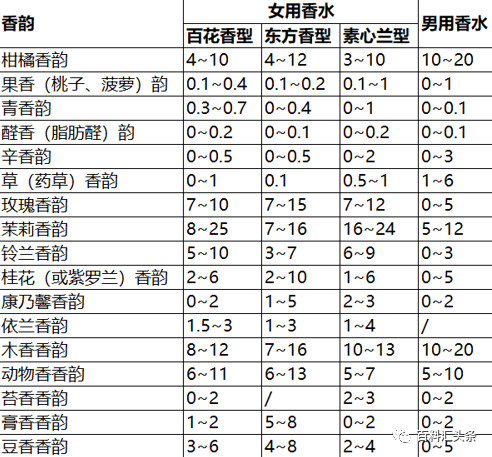 各香韵的用料比例量,可根据香型的不同进行变化,以花香型、东方香型、素心兰型视为基础,增加其他香韵的原料形成醛香(脂肪醛1%以下)型、青香(青香香料1.5%以下)型、辛香(辛香香料4%以下)型、革香(桦焦油、海狸香)型、烟香(烟叶净油、黑香豆净油)型等不同香型。