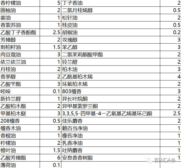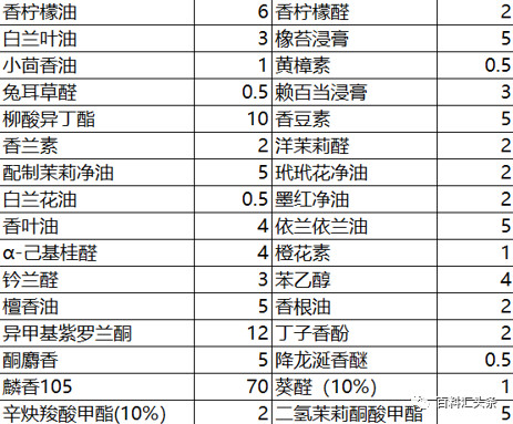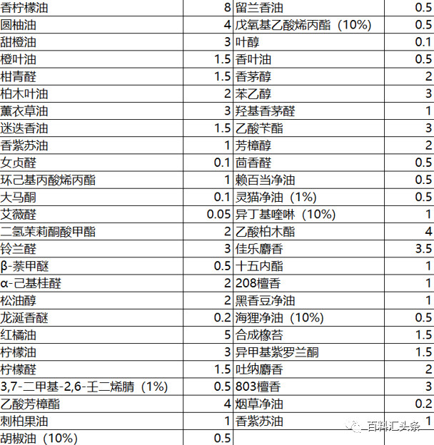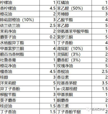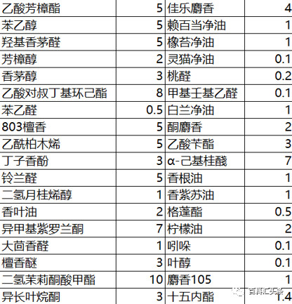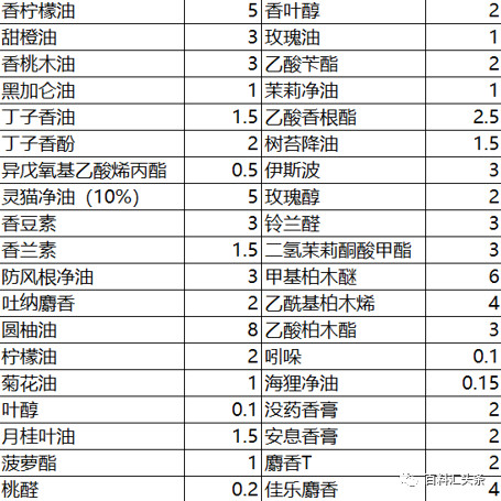 2、百花香型(复合花香型)香精配方举例——百花香型香精配方(质量份)
