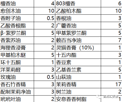 (9)木香(包括木香兼有龙涎香或壤香):檀香油(天然品)、803檀香、208檀香、檀香醚、伊斯波(ISO Esuper)、乙酰基柏木烯、甲基柏木醚、柏木油、乙酸柏木酯、广藿香油、香根油、乙酸香根酯。