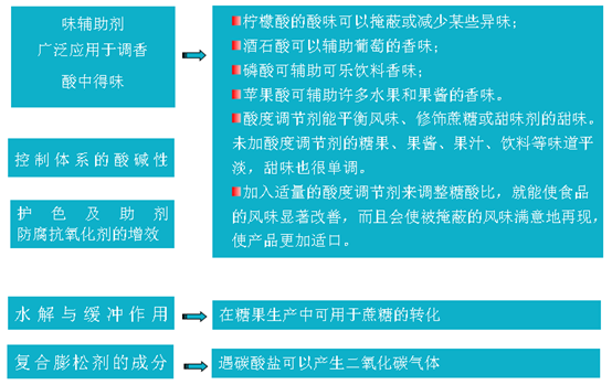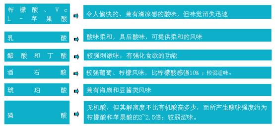 酸度调节剂通过阴离子影响食品风味,一般有机酸具有爽快的酸味,而无机酸的酸味不很适口,如前所述的盐酸、磷酸具有苦涩味,会使食品风味变劣。