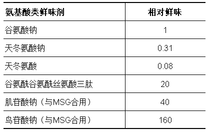 氨基酸类:L-谷氨酸钠(MSG、味精)、甘氨酸、L-丙氨酸、天冬氨酸
