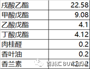 (3)介于上面两种配方之间,由γ-十一内酯、乙酸戊酯、丁酸戊酯、戊酸戊酯、乙酸乙酯、辛酸乙酯、肉桂酸乙酯、庚酸乙酯、苯乙酸乙酯、乙基香草醛以及斯里兰卡肉桂精油、鼠尾草精油、柠檬精油、多香果精油以及甜橙精油组成。
