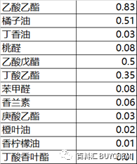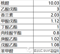 (4)进一步改善的桃子香精代表配方为,由γ-十一内酯、乙酸戊酯、丁酸戊酯、甲酸戊酯、己酸乙酯、戊酸乙酯、香草醛、苦杏仁精油、肉桂精油、香叶精油、苦橙精油、缬草精油以及少量的γ-壬内酯组成。