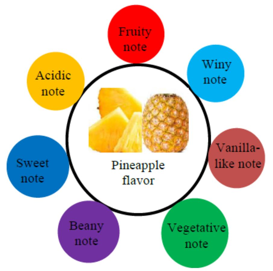 在菠萝果实挥发物中发现了一些芳香化合物。这些化合物包括酯类、醛类、醇类、酸类、内酯类等。这些香味化合物可用于菠萝香精配方。当然,虽然菠萝果实中没有一些香味成分,但这些原料也可以用来模仿菠萝的味道。原料的选择主要是根据这些成分的香韵。