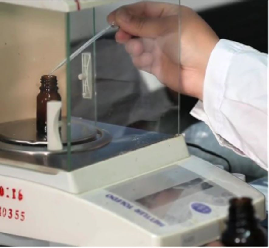 再次,根据鉴定出的菠萝香精的香韵,选择具有相同香韵的天然香料化合物和合成香料化合物,构建菠萝香精的初始配方。在此基础上,对原料和菠萝进行筛选,确定配料配比,模拟菠萝风味。根据最初设计的菠萝风味配方,将所有原料放入一个瓶子中,用天平仔细称重,如图4所示。